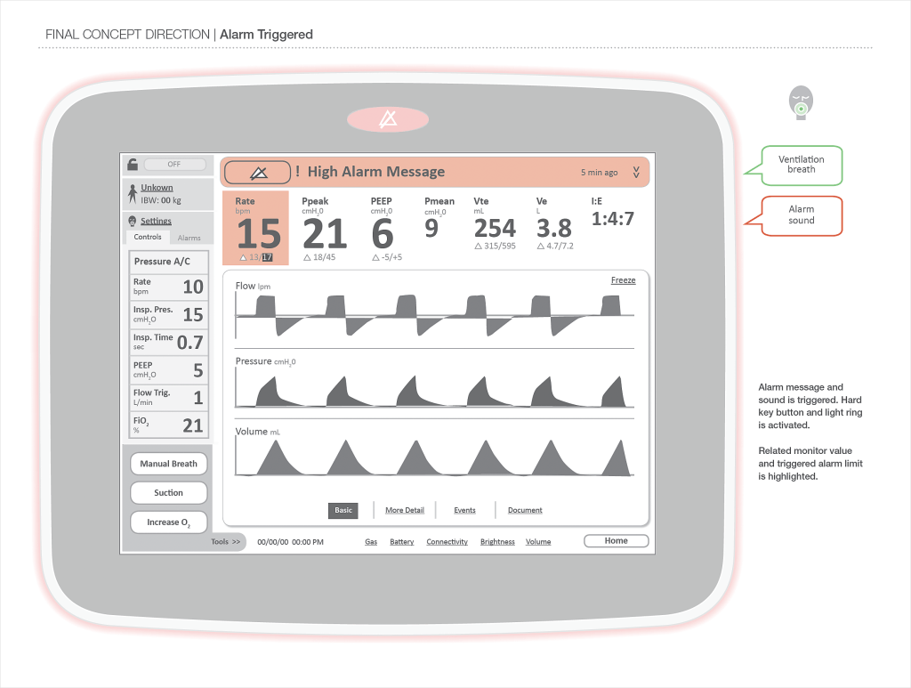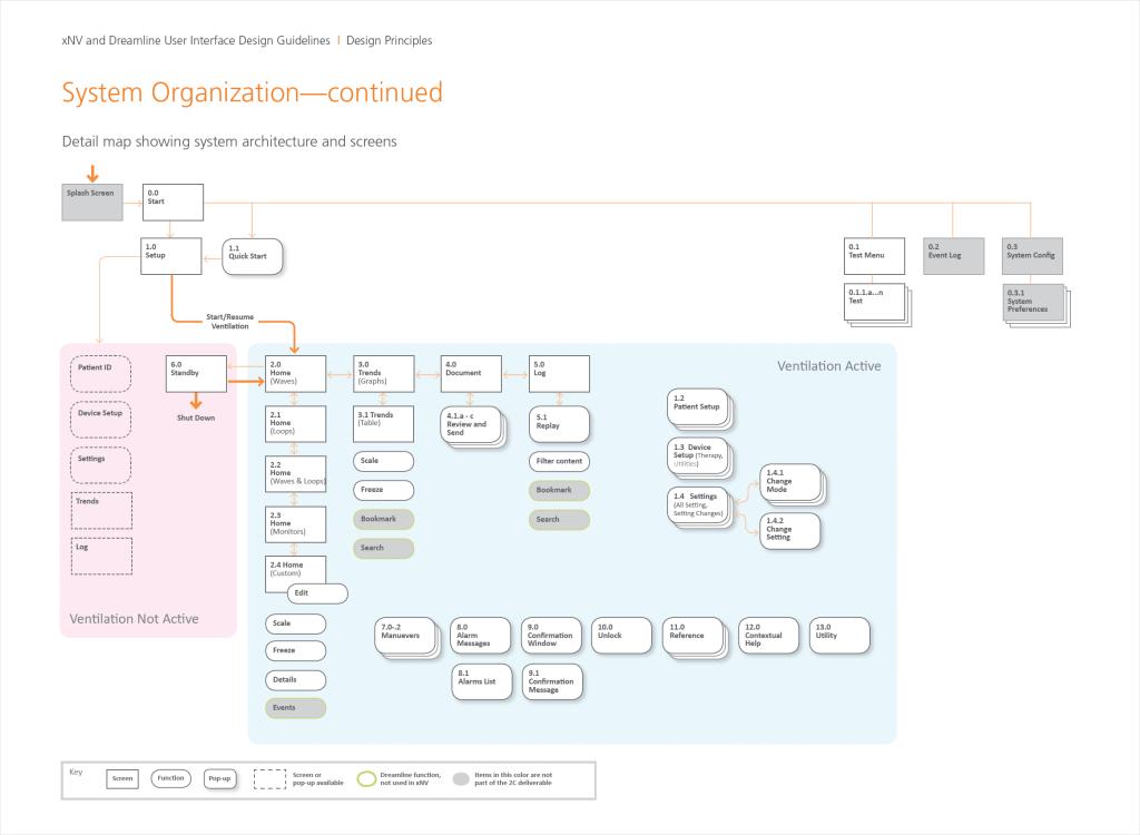 Design a single user interface strategy for two CareFusion ventilators—xNV and Dreamline. The product would be replacing the existing ventilator product family, and needed to be customizable for a range of clinical acuity and patient sizes.