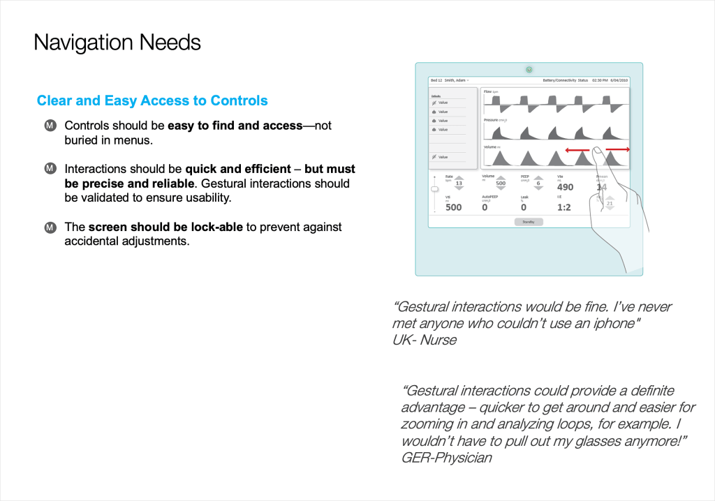 The design research took place at 11 hospitals in 6 countries, with 57 users being interviewed. The research focused on understanding both the hardware and software experience, and exploring concepts with end users. Interactive PDFs were created for each concept and presented on an iPad for assessment. Findings were summarized and presented in a detailed report. Key UI findings included: