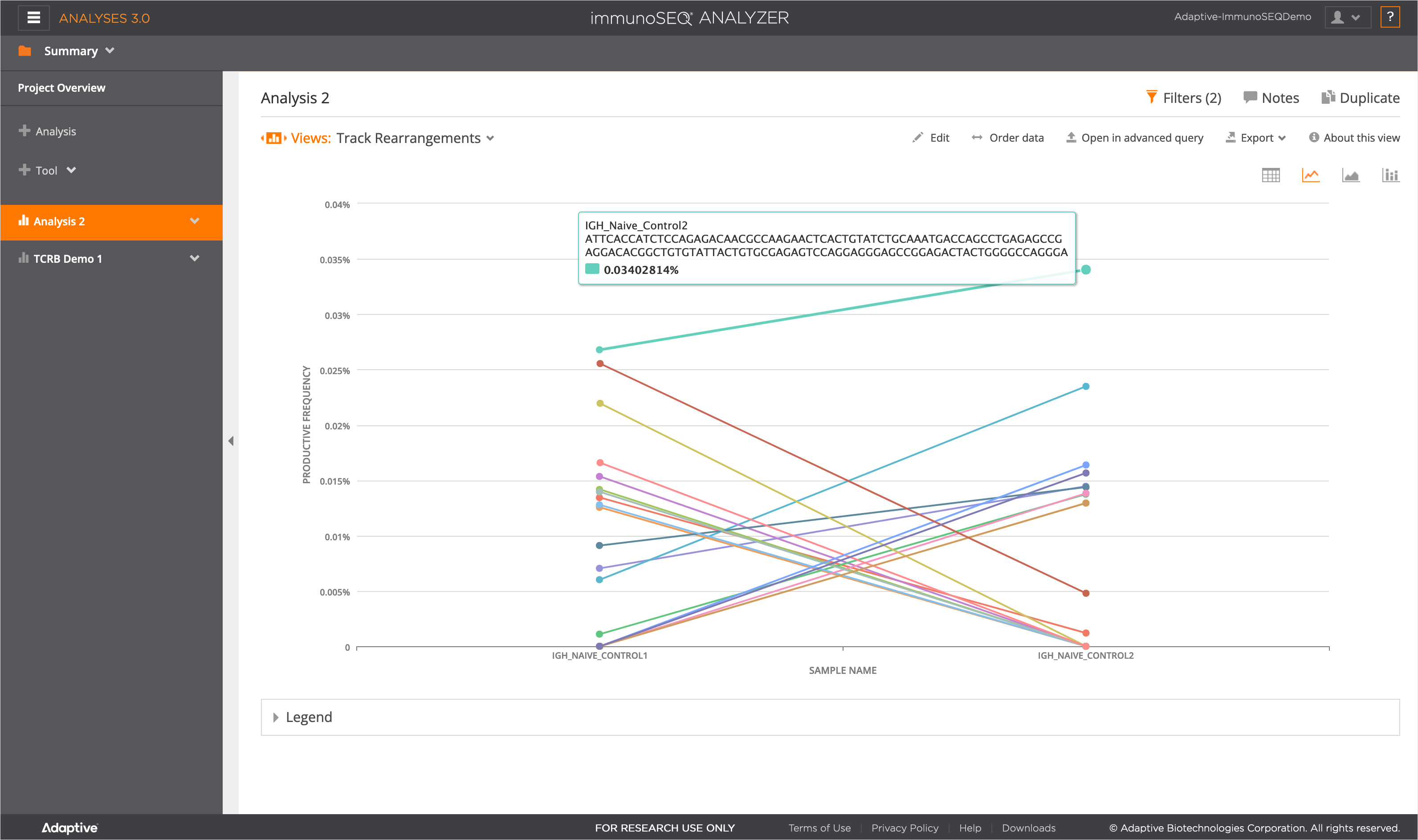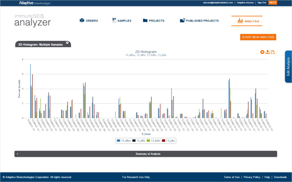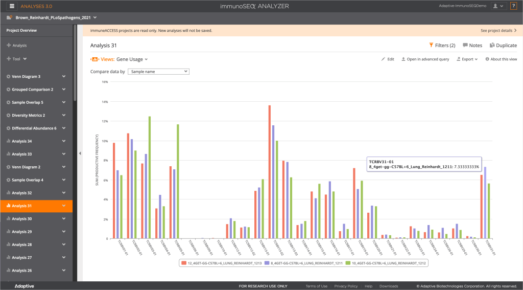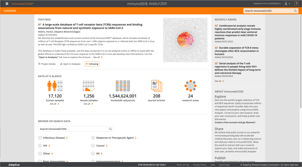 immunoSEQ Analyzer is an analytics tool for researching the adaptive immune system. The tool helps researchers analyze and explore massive immunosequencing data sets using analysis tools, compare analyses from other researchers, and share and publish projects with colleagues.