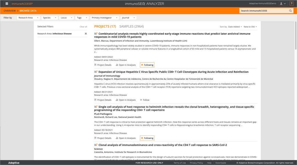- organize and share projects with colleagues or as public data sets in immuneAccess—the largest open-access database of T- & B-cell annotated receptor sequences.